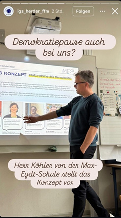Kurz darauf waren wir an der IGS Herder in Frankfurt zu Gast. Dort durften wir unser Schulprojekt, die Demokratie-Mittagspause, vorstellen – ein Format an unserer Schule, das regelmäßig Raum für Austausch, Diskussion und Mitgestaltung schafft. Im Rahmen des dortigen pädagogischen Tages führten wir einen Workshop durch, in dem wir unser Konzept detailliert erklärten und gemeinsam weitergedacht haben. Die Rückmeldungen waren überaus positiv: Die Schule plant nun, die Demokratie-Mittagspause ebenfalls einzuführen. Ein großer Erfolg und ein wertvoller Beitrag zur Vernetzung demokratischer Bildungsarbeit in Hessen.